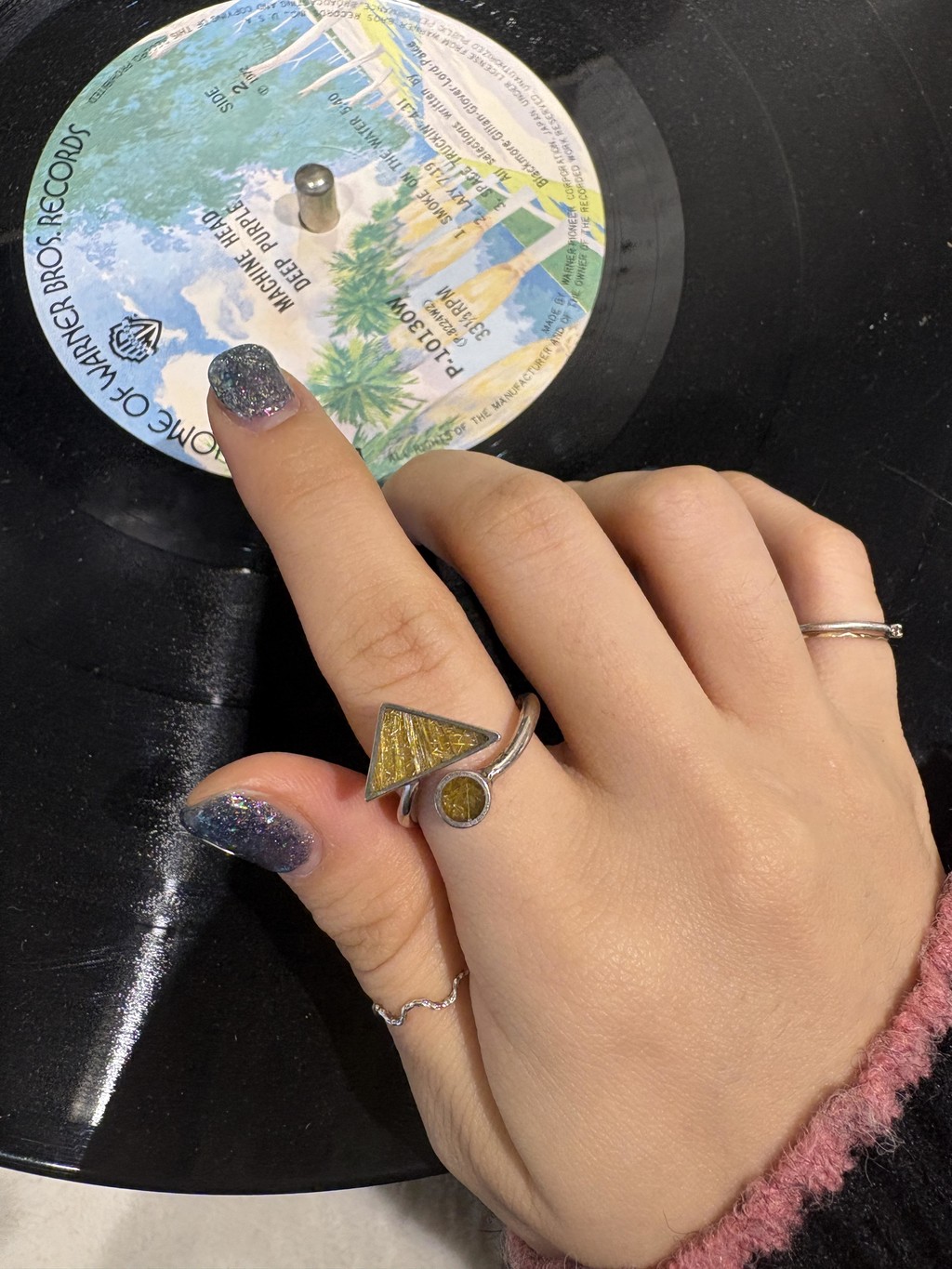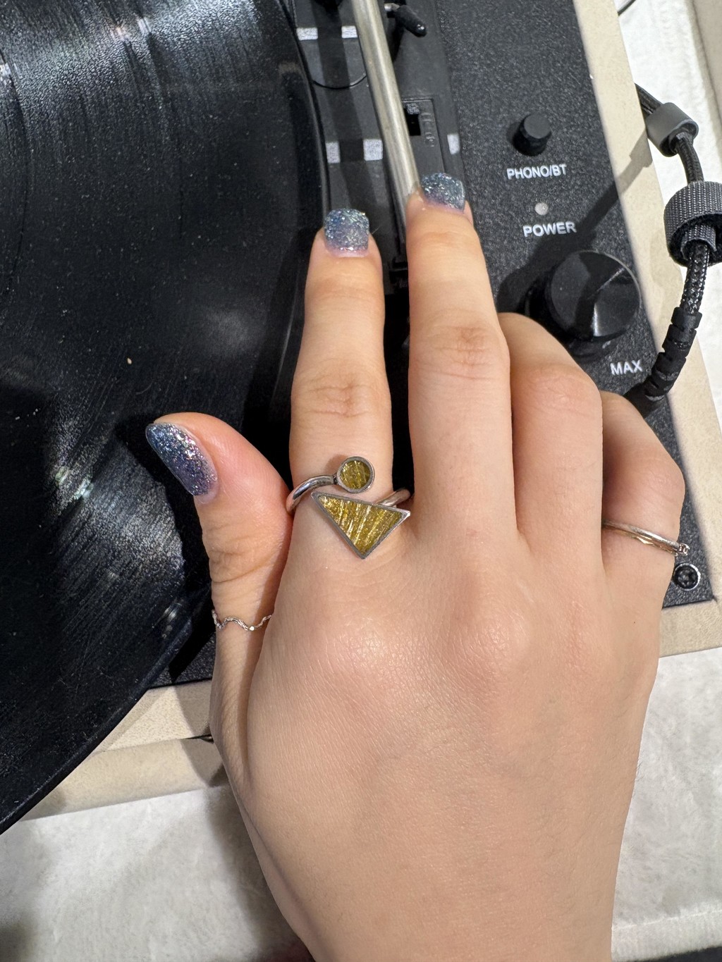 스튜디오 JHK는 기존에 금침수정 반지 디자인으로 흔히 쓰이던 앤틱하거나 에스닉한 느낌을 배제시키고 좀 더 현대적인 감각을 살렸어요. 삼각형과 원형의 두 개의 원석을 베젤로 감싸서 기하학적인 디자인 오픈링으로 탄생시켰답니다. 옷감에 걸리지 않아서 스웨터에 편하게 데일리로 착용하기도 좋을 스타일이에요.