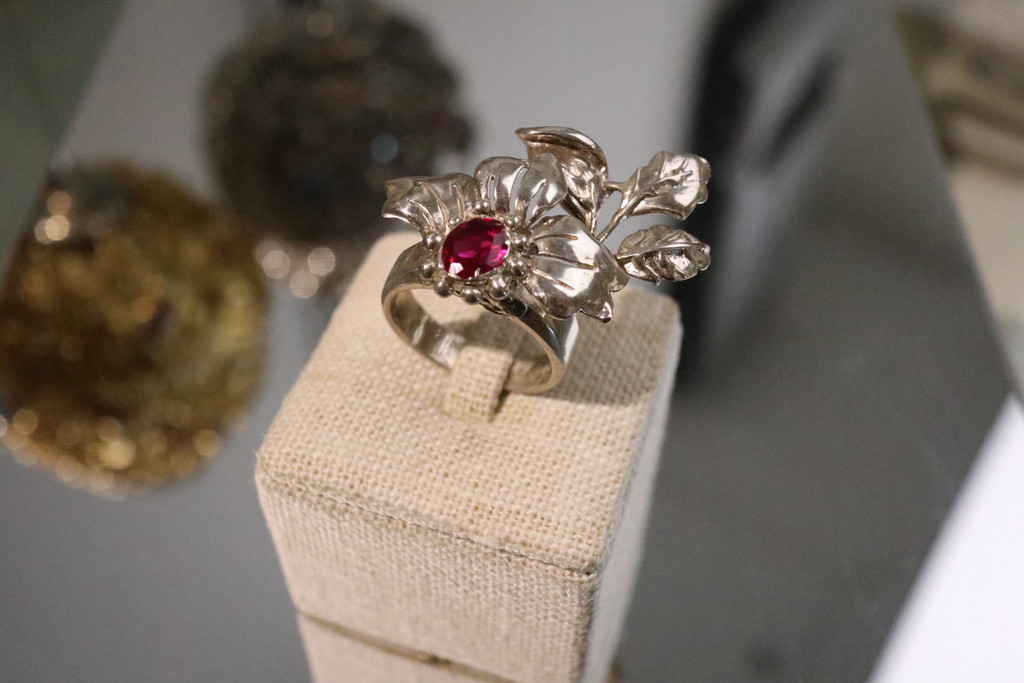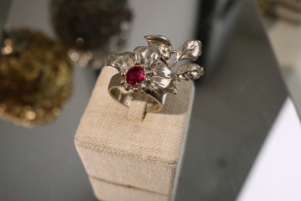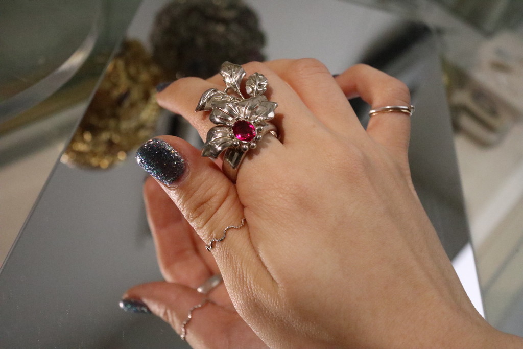 루비와 같은 색깔의 붉은 큐빅이 박혀있는, 장미를 연상케 하는 실버링입니다.