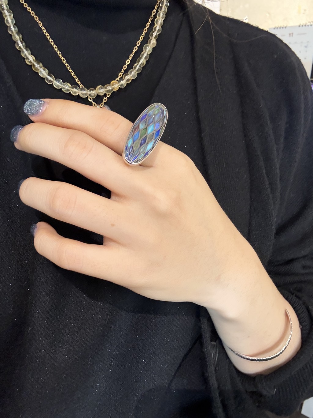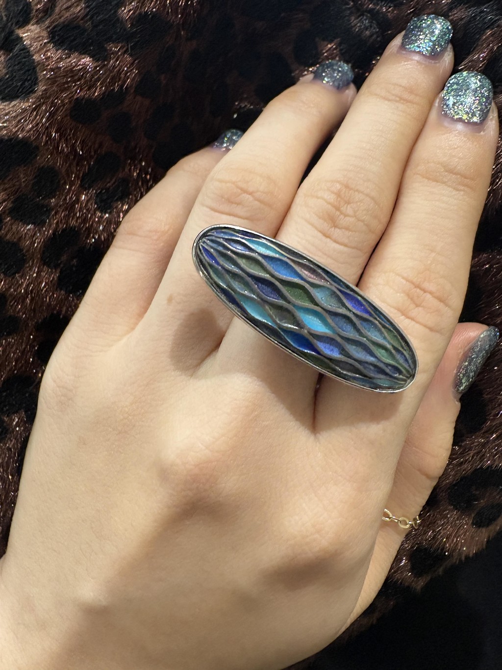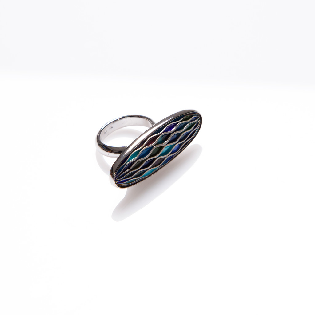 순은 위에 세가지 색상의 칠보를 얹어 가마에서 앞뒤로 구워 완성한 반지입니다.