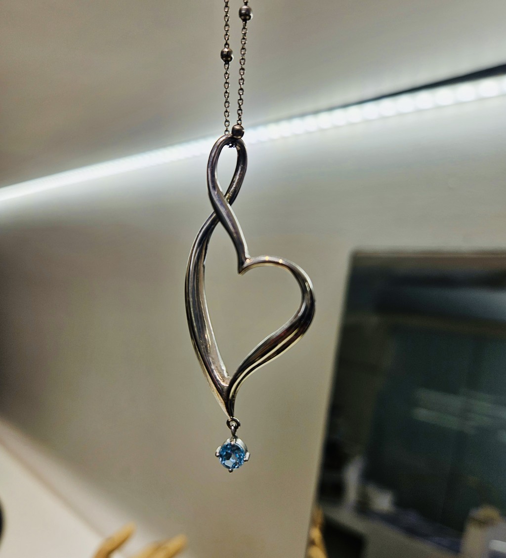 라운드 아쿠아마린이 물방울처럼 하트 아래로 톡 떨어지는 디자인의 목걸이입니다 .