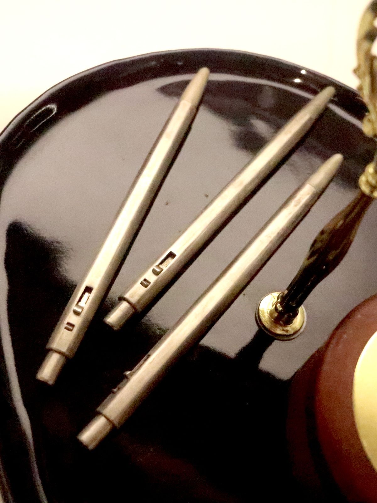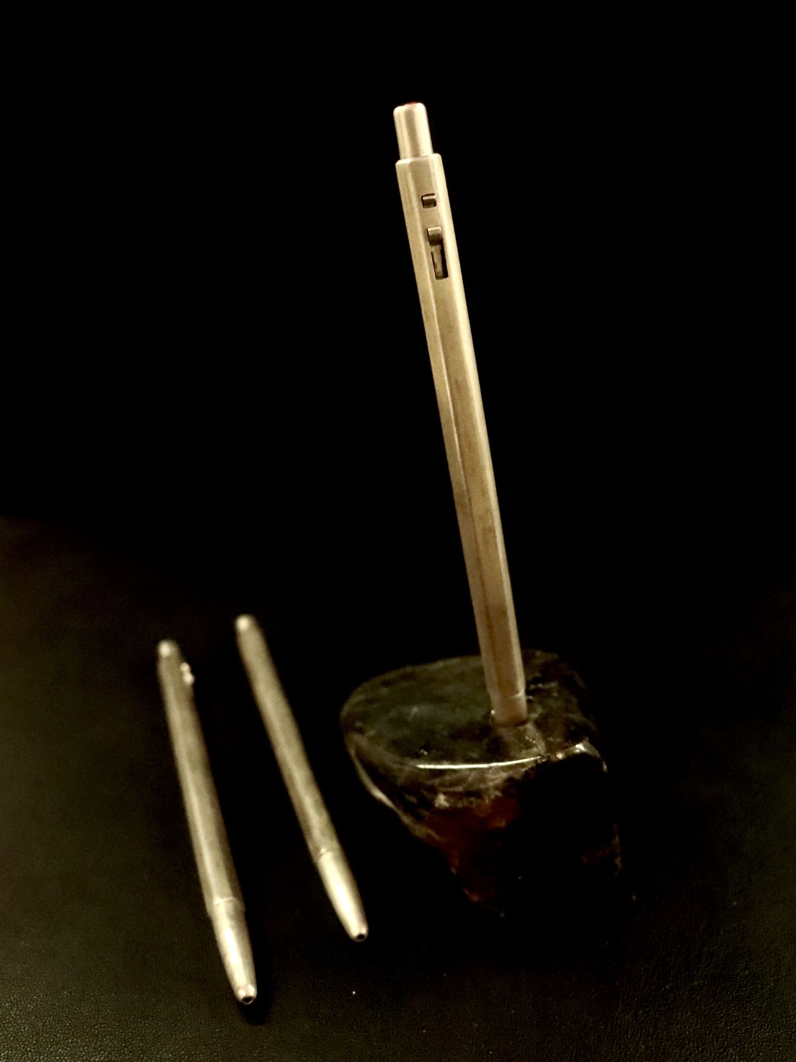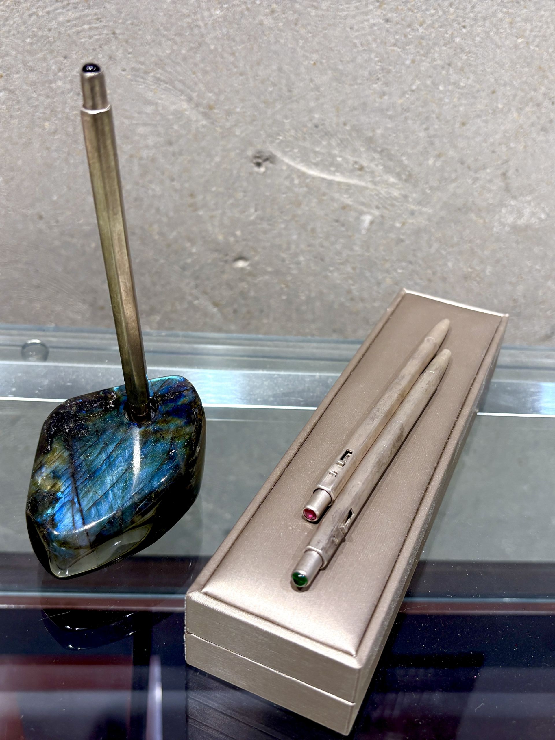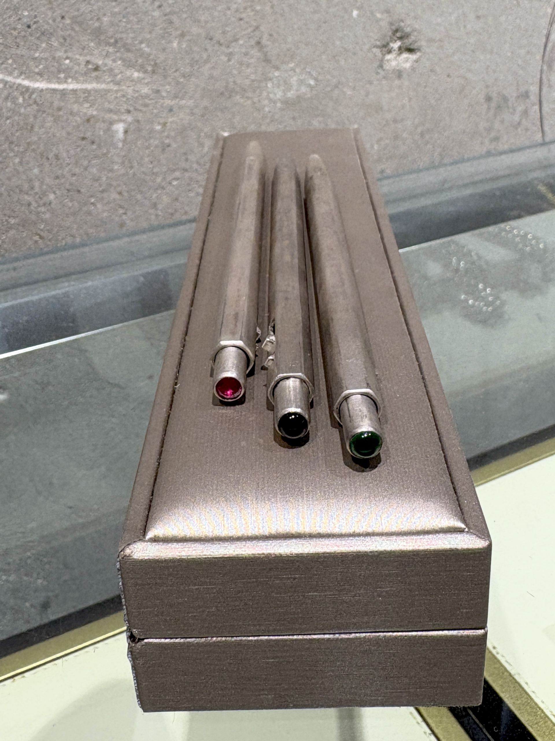 정은(sterling silver)으로 제작된 실버 볼펜 케이스입니다. 상단은 에폭시 구슬(그린, 레드, 블랙)로 장식하였어요.
